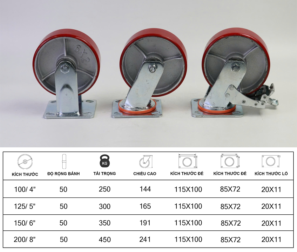 | Chịu tải | 100mm = 250kg, 125mm = 300kg, 150mm = 350kg, 200mm = 450kg |