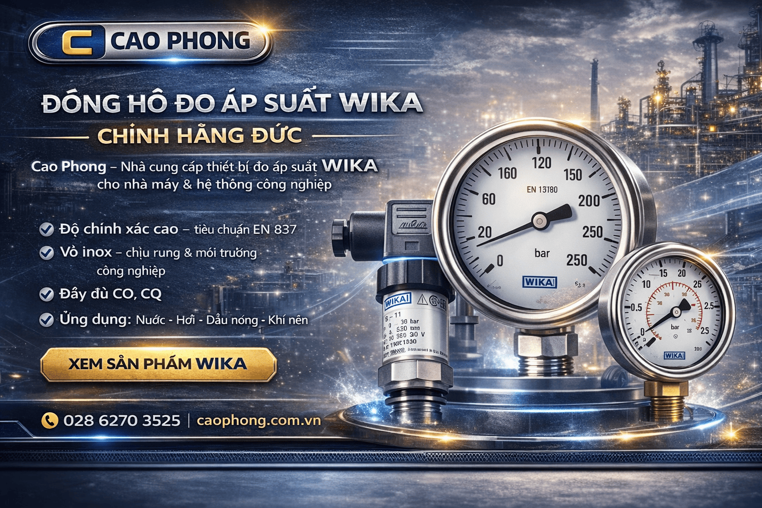 Công Ty TNHH TM TBCN Cao Phong là đơn vị chuyên cung cấp đồng hồ đo áp suất WIKA chính hãng, phục vụ cho các hệ thống hơi, nước, khí nén, dầu và hóa chất trong nhiều ngành công nghiệp.