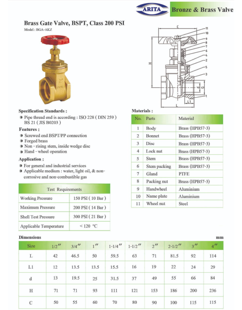 | Thông số kỹ thuật Van Cổng đồng BGA-AKZ – ARITA | |